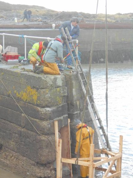 We are delighted to see the promised emergency repairs to the grooves which hold the booms in place are underway today, Thursday 16 January 2014. Picture shows local crew of Micheál Ó Ceadagáin, Séan Ó Drisceoil and Harbour Master, Fachtna Ó Drisceoil at work being overlooked by Co Op Manager, Mairtín Ó Méalóid. Today also saw representatives of Keatings COntractors return to the Islands to access the damaged caused to the partly built slip and to the equipment and materials left on site.