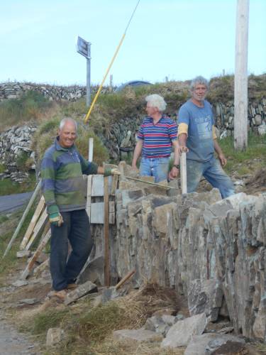 These days visitors to Cape Clear Island are reassured that the skills needed to build the finest stone walls are still in abundance when they see the works being carried out close to the cross to replace an old stone wall. Photo shows a view of the partly finished wall and of the builders, Patsi & Fachtna Ó Drisceoil accompanied by Finbarr Hennessy. If a job is worth doing its worth doing right. Bail ó Dhia ar an obair !.