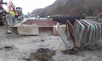 Dún an ÓirWe enclose some photos showing the current practice for securing the Cailin Óir in bad weather pending the completion of the works on the pier sides. Also a photo showing the formwork for laying the second slab of the new pier section, work which was completed successfully yesterday.Formwork Cape Pier