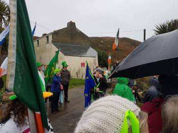 Great fun was has by all who took part in the first ever St Patricks Day Parade on Cape Clear Island. There were seventy humans, four dogs, a goat and a sheep all led by Grand Marshalls Chuck and Nell Kruger that braved wind and light rain to parade from South to North Harbours. Not to be outdone by larger events, we mustered a band of 12 tin whistles, Steve with his ‘ugly stick’, an assortment of bodhráns and drums and all the flags on the Island. The parade was halted three times for well researched side events which included sean nós dancing, singing, twirling batons, banishing the snakes and The Walls of Limerick. Afterwards the happy throng retired to Club Cléire for an afternoon of convivial music and chat. We thank the chief organizers Stella and Caoimhe for this wonderful event and for a fun filled day. Cléire abú.